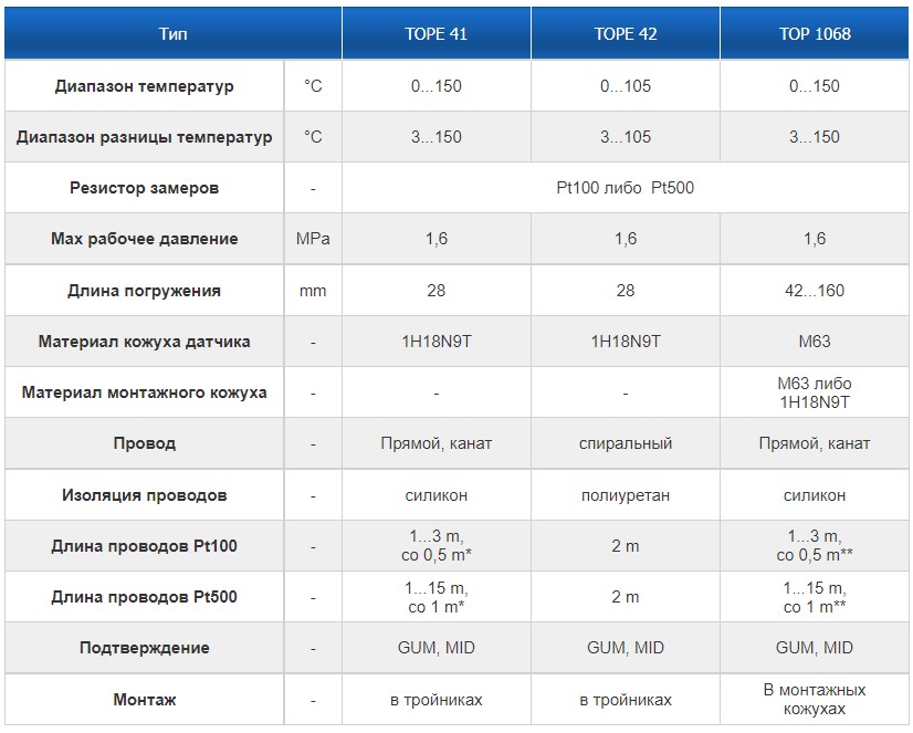 Датчики TOPE 41 и TOPE 42 предназначены для замера температуры жидких веществ, главным образом в качестве парных датчиков для теплосчетчиков. Измерительные датчки изготовлены на базе платинового резистора Pt100 либо Pt500. Датчики поставляются парами. Датчики могут монтироваться в штекере: тройника, клапана или корпуса из преобразователя компактного теплосчетчика типа: Elf, CQM-III-K и SHARKY 473 (DN15 и 20).