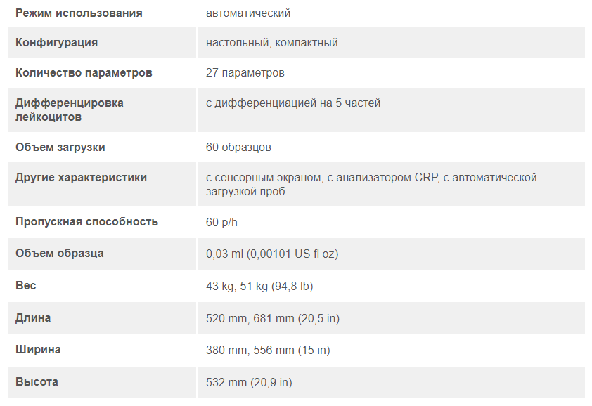 - Объем дозирования проб: 20 мкл (цельная кровь, режим CBC), 25 мкл (цельная кровь, режим CBC+DIFF), 18 мкл (цельная кровь, режим CRP), 28 мкл (цельная кровь, режим CBC+CRP), 30 мкл (цельная кровь, режим CBC+DIFF+CRP), 20 мкл (кровь предразведения)