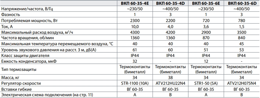 Рабочие лопатки вентиляторов загнуты вперед. Используются асинхронные электродвигатели с внешним ротором. Корпус изготовлен из оцинкованной стали. Для защиты от перегрева вентиляторы оснащены встроенными термоконтактами с выводами для подключения к устройству защиты двигателя.