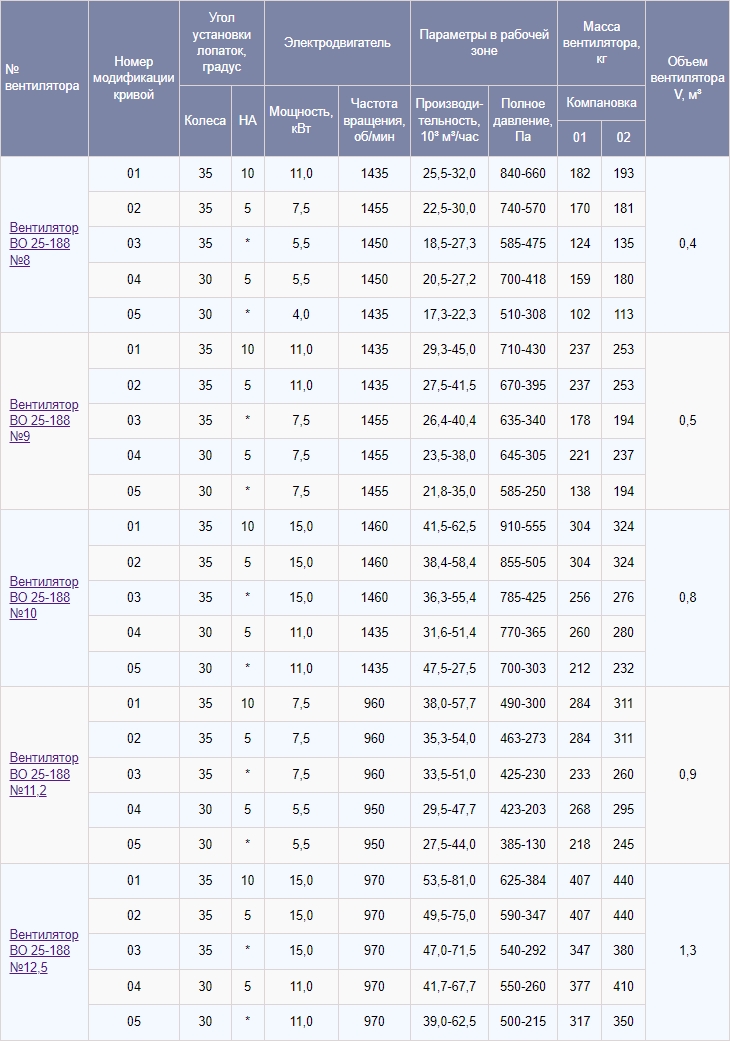 Вентиляторы низкого давления ВО 25-188 производятся в пяти типоразмерах (отличаются по мощности, производительности и развиваемому давлению), каждый из типоразмеров может иметь следующие исполнения: