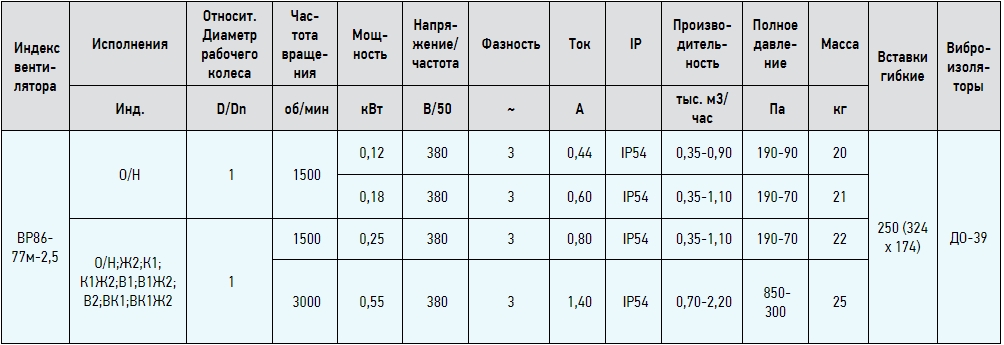 Вентиляторы серии ВР 86-77М представляют собой радиальные вентиляторы одностороннего всасывания с рабочими лопатками, загнутыми назад. Направление вращения — правое и левое. Корпус вентилятора изготовлен из оцинкованной стали. Привод — трехфазный асинхронный электродвигатель. Для защиты от перегрева вентиляторы серии ВР 86-77М снабжены встроенными термодатчиками с выводами для подсоединения устройства защиты двигателя.