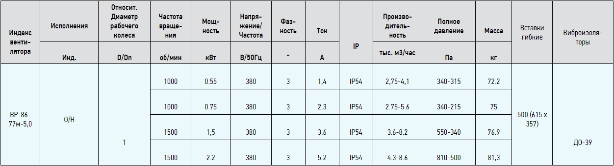 Вентиляторы серии ВР 86-77М представляют собой радиальные вентиляторы одностороннего всасывания с рабочими лопатками, загнутыми назад. Направление вращения — правое и левое. Корпус вентилятора изготовлен из оцинкованной стали. Привод — трехфазный асинхронный электродвигатель. Для защиты от перегрева вентиляторы серии ВР 86-77М снабжены встроенными термодатчиками с выводами для подсоединения устройства защиты двигателя.