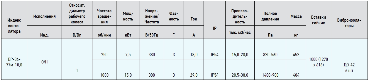Вентиляторы серии ВР 86-77М представляют собой радиальные вентиляторы одностороннего всасывания с рабочими лопатками, загнутыми назад. Направление вращения — правое и левое. Корпус вентилятора изготовлен из оцинкованной стали. Привод — трехфазный асинхронный электродвигатель. Для защиты от перегрева вентиляторы серии ВР 86-77М снабжены встроенными термодатчиками с выводами для подсоединения устройства защиты двигателя.