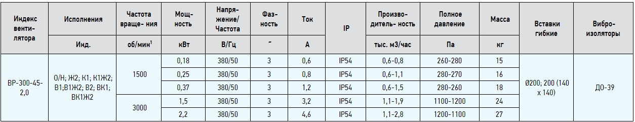 Вентиляторы серии ВР 300-45 (ВЦ 14-46) представляют собой радиальные вентиляторы одностороннего всасывания с рабочими лопатками, загнутыми вперед. Направление вращения — правое и левое. Корпус вентилятора изготовлен из оцинкованной стали. Привод — трехфазный асинхронный электродвигатель.