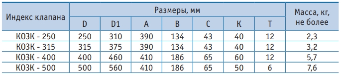 Конструкция клапана КОЗК-1 представляет собой корпус, выполненный из оцинкованной стали, в который вставлена заслонка из огнеупорного материала. Заслонка переводится в рабочее положение приводом установленном снаружи клапана.