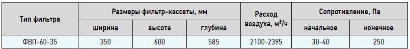 Фильтр ФВП состоит из корпуса и фильтр-кассеты карманного типа. Корпус изготавливается из оцинкованной стали; крышка к корпусу крепится простыми защелками и петлями. Корпус фильтра снабжен шинорейкой для присоединения воздуховодов или компонентов вентиляционной системы. Фильтрующие элементы устанавливаются в направляющих и поэтому легко извлекаются при замене. Корпуса могут быть установлены горизонтально и вертикально. Фильтрующий материал выполнен в виде кассеты с карманными фильтрами из синтетического волокна и имеет класс очистки G3, G4, F5, F7.