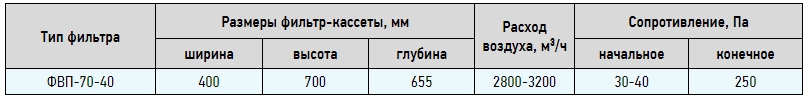 Фильтр ФВП состоит из корпуса и фильтр-кассеты карманного типа. Корпус изготавливается из оцинкованной стали; крышка к корпусу крепится простыми защелками и петлями. Корпус фильтра снабжен шинорейкой для присоединения воздуховодов или компонентов вентиляционной системы. Фильтрующие элементы устанавливаются в направляющих и поэтому легко извлекаются при замене. Корпуса могут быть установлены горизонтально и вертикально. Фильтрующий материал выполнен в виде кассеты с карманными фильтрами из синтетического волокна и имеет класс очистки G3, G4, F5, F7.