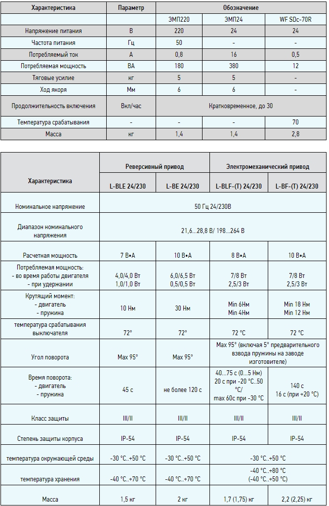 В приводах используются электромагниты постоянного тока на 12 В, а также со встроенным двухполупериодным выпрямителем, работающие от сети переменного тока 50 Гц напряжением 220 В. Приводы оснащаются микропереключателями для контроля положения заслонки клапанов.