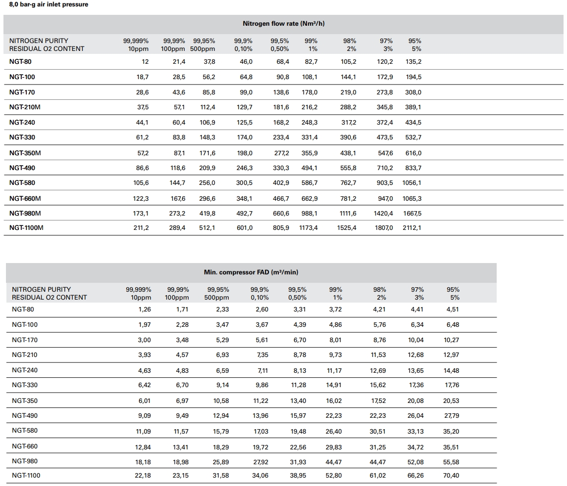 Для генераторов азота NGO требуются внешние фильтры серий SGO и FGO, а также осушитель серии DGO. Они необходимы для удаления твердых частиц, а также остатков воды и масла из всасываемого воздуха, питающего ваш азотный генератор PSA серии NGO. Степень очистки на входе должна соответствовать классу 1.4.1 стандарта ISO 8573-1:2010 (<0,01 мкм / DP + 3 °C / <0,003 мг/м3).
