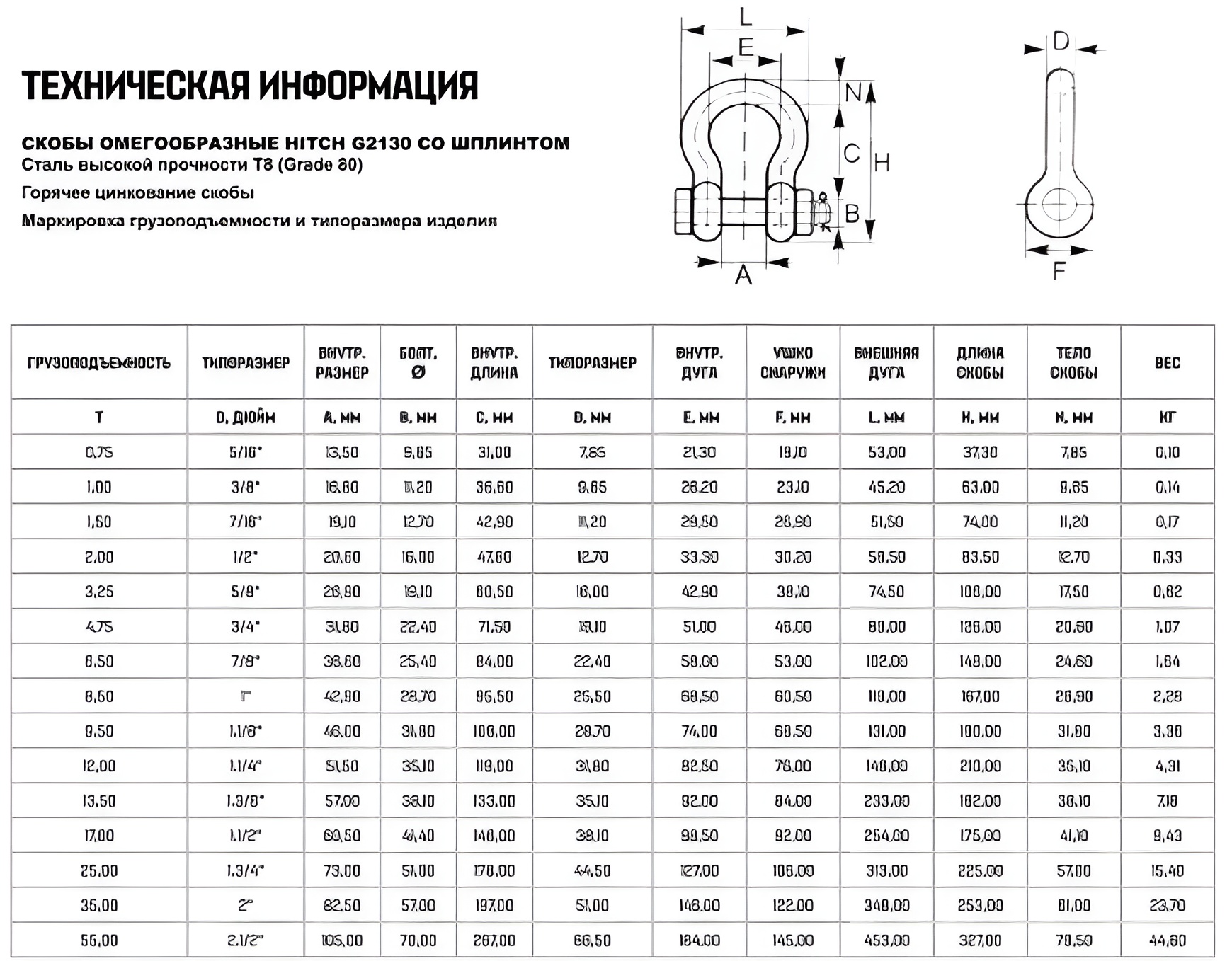 Омегообразная скоба со шплинтом HITCH G2130 представляет собой универсальный такелажный элемент, который используется для надежного соединения деталей оснастки или фиксации оборудования. Этот тип скобы обеспечивает прочность, долговечность и удобство монтажа, что делает его незаменимым в широком спектре задач.