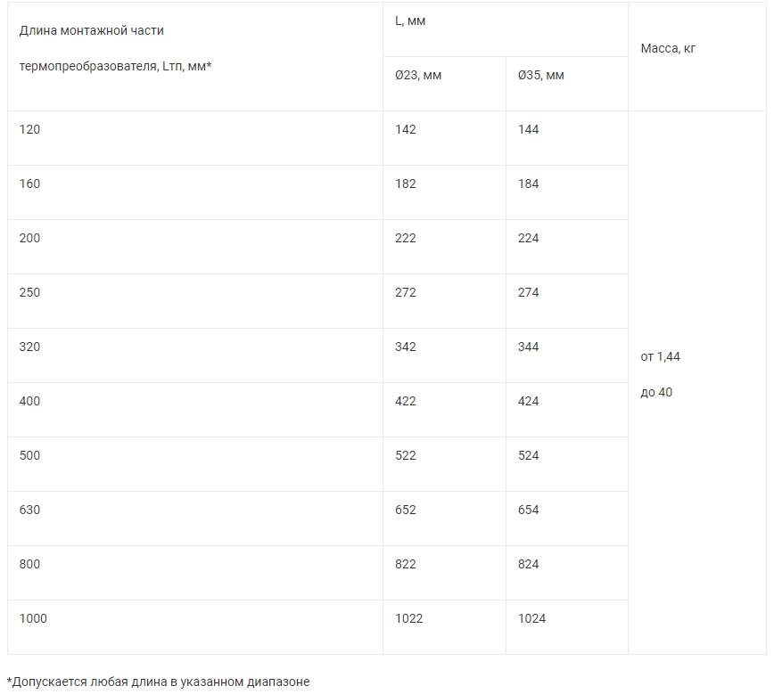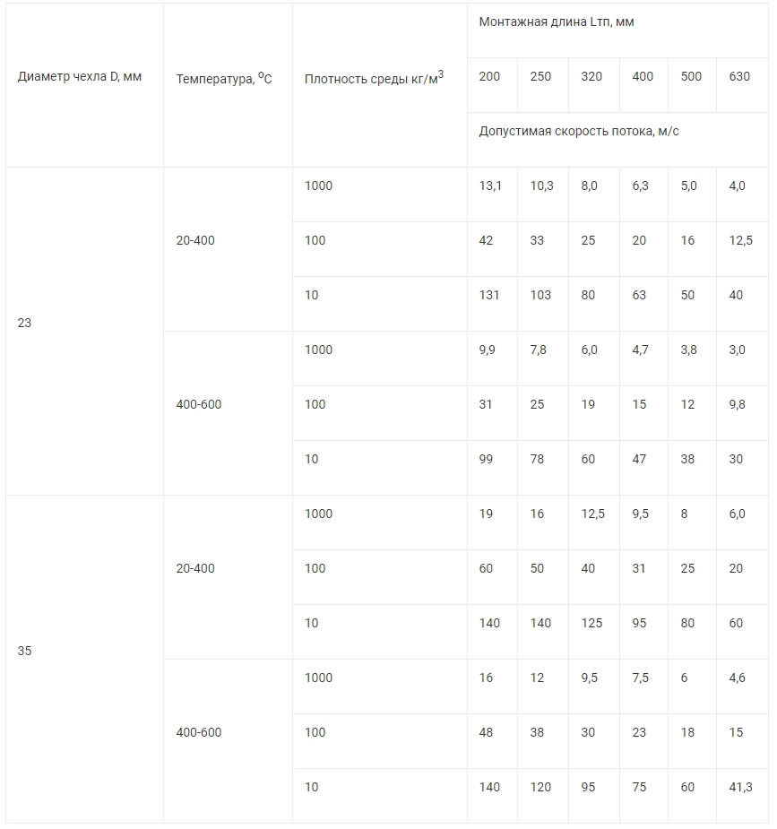 Допустимые скорости потоков в зависимости от плотности среды и длины монтажной части термопреобразователя Lтп, мм*